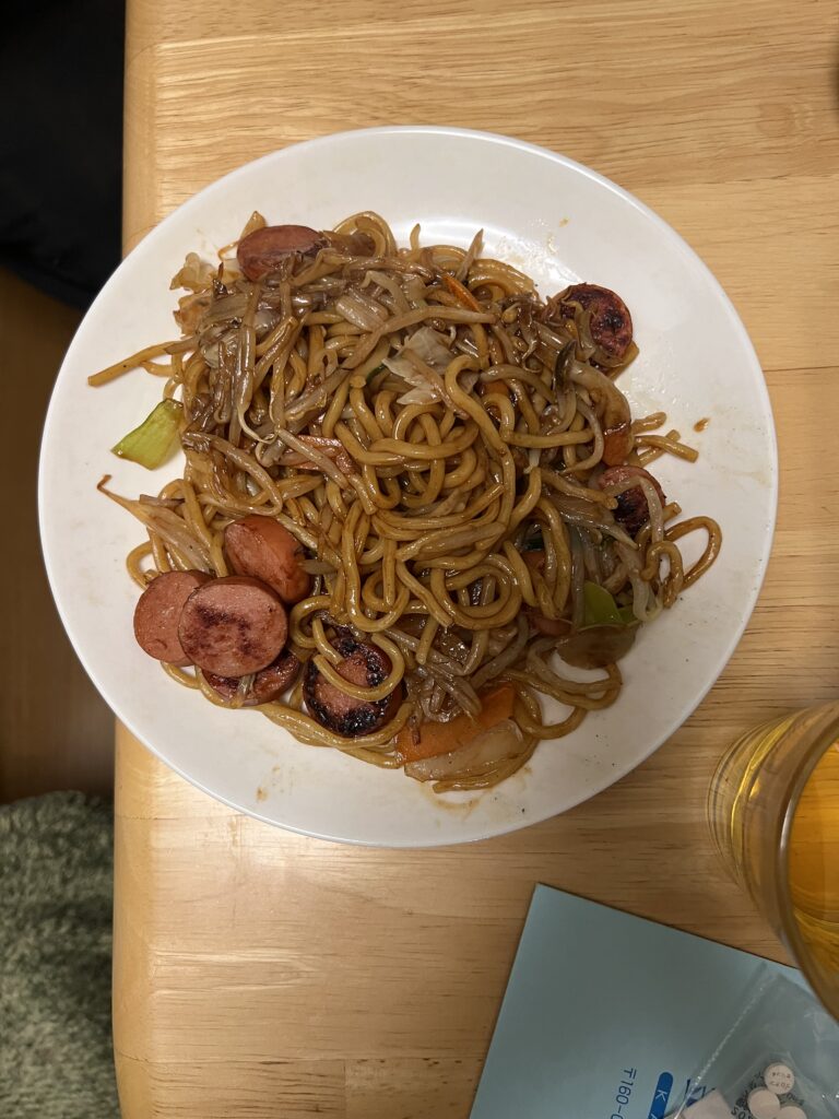 今日は、7時頃起きた。マルちゃんの焼きそば太麺を作った。具は8品目の野菜とフランクフルトだ。まず麺をお湯で温めて、フランクフルトを小さく輪切りにし、炒め、取り出し、8品目の野菜を炒めて、良く炒まった所で、フランクフルトを加え、麺をフライパンに入れ、水をかけて、箸でほぐしながら炒め、最後に液体ソースをかけて混ぜ合わせて完成だ。